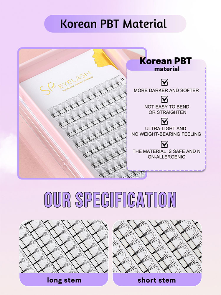 Fanii premadei 12D scurte genele de tulpini scurte de SP Eyelash sunt realizate manual de la mătase premium coreeană PBT, oferind o senzație moale și naturală. Finisajul ultra-întunecat adaugă adâncime și dramă, în timp ce bazele ultra-subțiri, puternice și durabile asigură ridicarea și aplicarea fără efort, ceea ce face ca aceste genele să nu fie doar luxoase, ci și fiabile.